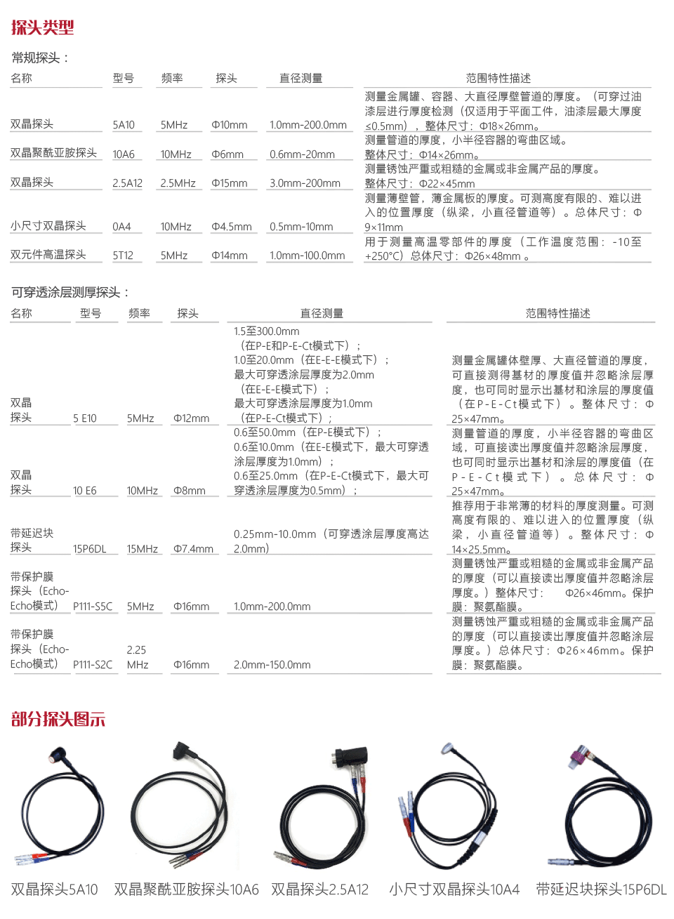 | 測量厚度范圍(對于鋼)*T | 雙晶探頭:0.5-300 mm;單晶探頭(帶延遲塊):0.25-10mm用于鋼;可穿透涂層的雙晶探頭(用于厚度≤2.0mm的保護(hù)涂層下的金屬測量):0.25~100mm |