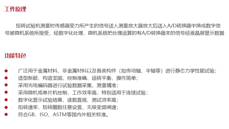 工作原理扭轉試驗機測量時傳感器受力所產生的信號送入測量放大器放大后送入A/D轉換器中換成數字信號被微機系統所接受,經數字化處理,微機系統把處理運算的有A/D轉換器來的信號經液晶屏顯示數據。
