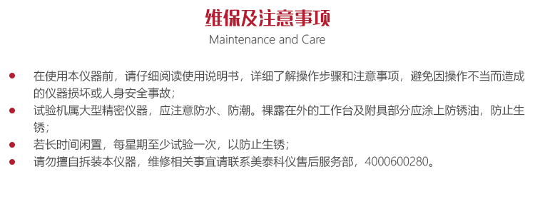 試驗機屬大型精密儀器,應注意防水、防潮。裸露在外的工作臺及附具部分應涂上防銹油,防止生銹;