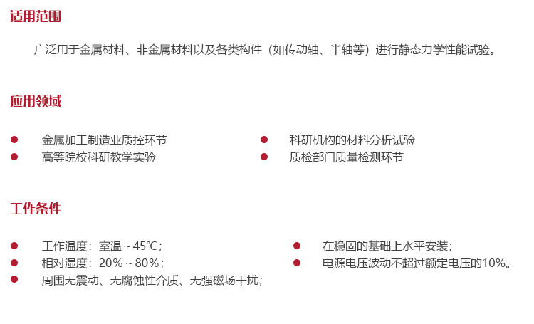 功能用途廣泛用于金屬材料、非金屬材料以及各類構件(如傳動軸、半軸等)進行靜態力學性能試驗。