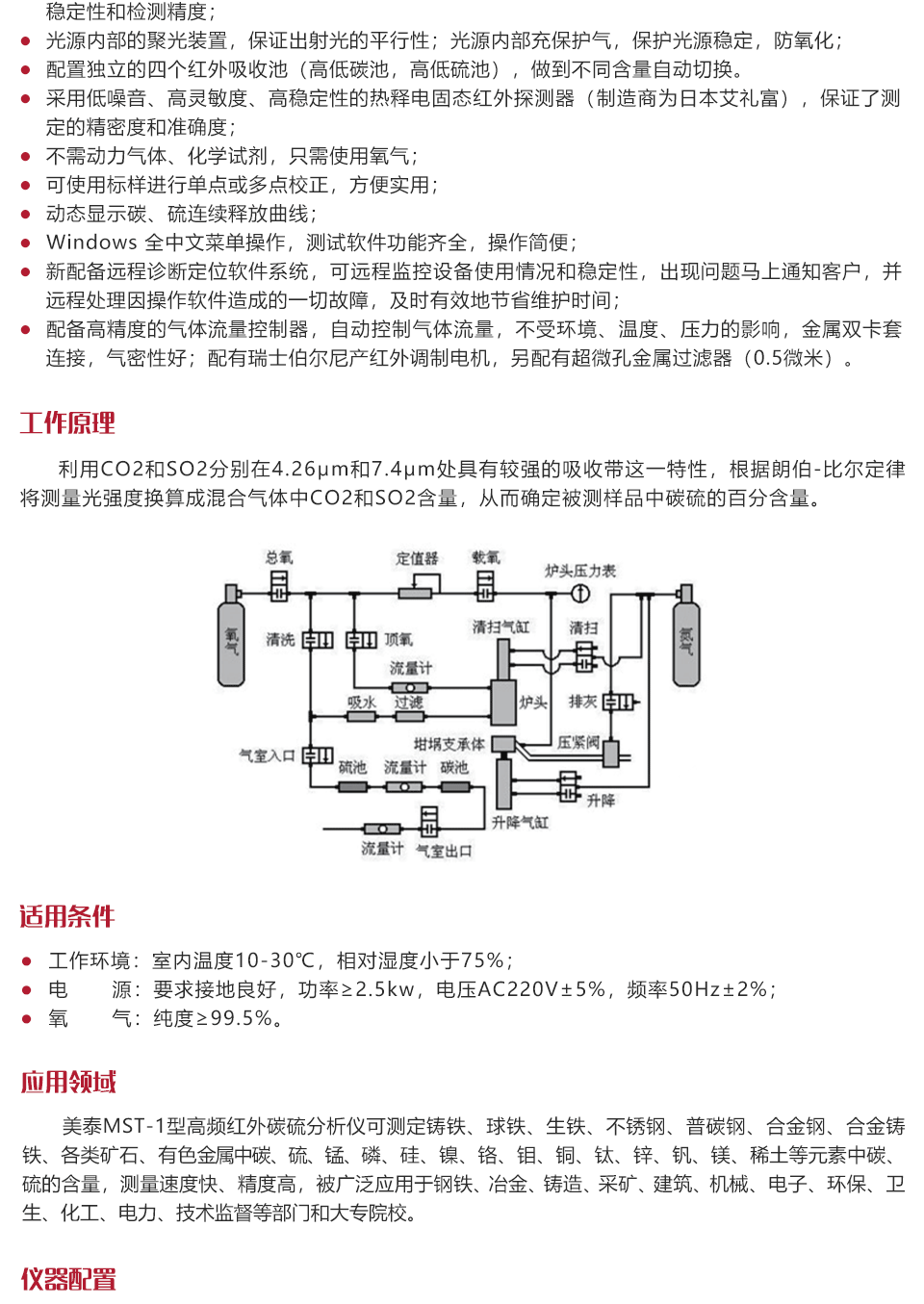 工作原理利用CO2和SO2分別在4.26μm和7.4μm處具有較強的吸收帶這一特性,根據朗伯-比爾定律將測量光強度換算成混合氣體中CO2和SO2含量,從而確定被測樣品中碳硫的百分含量