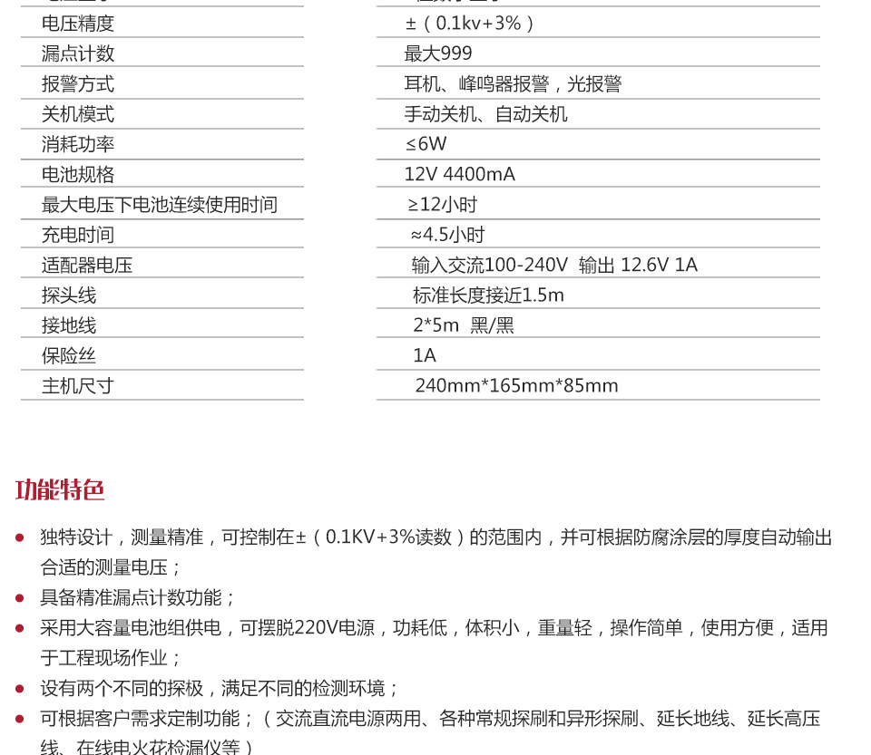 功能用途?適用于不同厚度的搪玻璃、玻璃鋼、環氧煤瀝青和橡膠襯里等涂層的質量檢測。