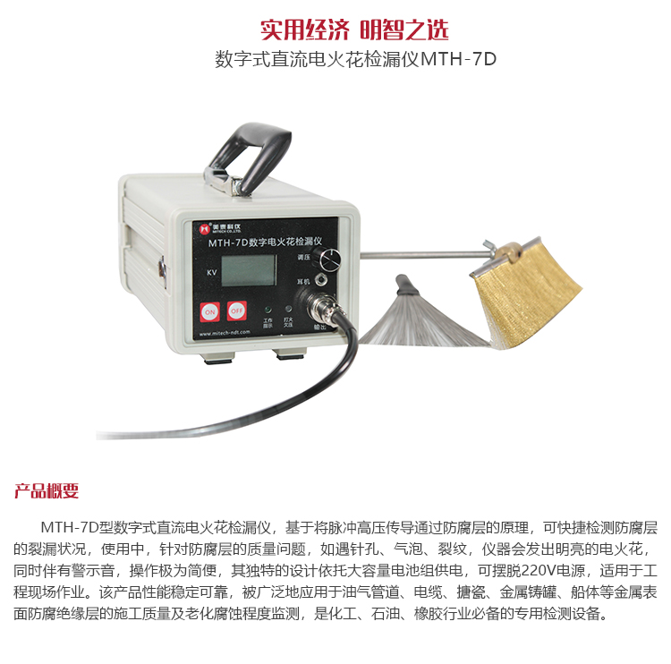 產品概述MTH-7D型數字式直流電火花檢漏儀,基于將脈沖高壓傳導通過防腐層的原理,可快捷檢測防腐層的裂漏狀況。使用中,針對防腐層的質量問題,如遇針孔、氣泡、裂紋,儀器會發出明亮的電火花,同時伴有警示音,操作極為簡便,其獨特的設計依托大容量電池組供電,可擺脫220V電源,適用于工程現場作業。該產品性能穩定可靠,被廣泛地應用于油氣管道、電纜、搪瓷、金屬鑄罐、船體等金屬表面防腐絕緣層的施工質量及老化腐蝕程度監測,是化工、石油、橡膠行業必備的專用檢測設備。