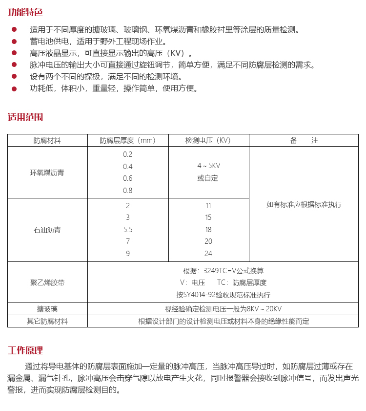 工作原理通過將導電基體的防腐層表面施加一定量的脈沖高壓,當脈沖高壓導過時,如防腐層過薄或存在漏金屬、漏氣針孔,脈沖高壓會擊穿氣隙以放電產生火花,同時報警器會接收到脈沖信號,而發出聲光警報,進而實現防腐層檢測目的。