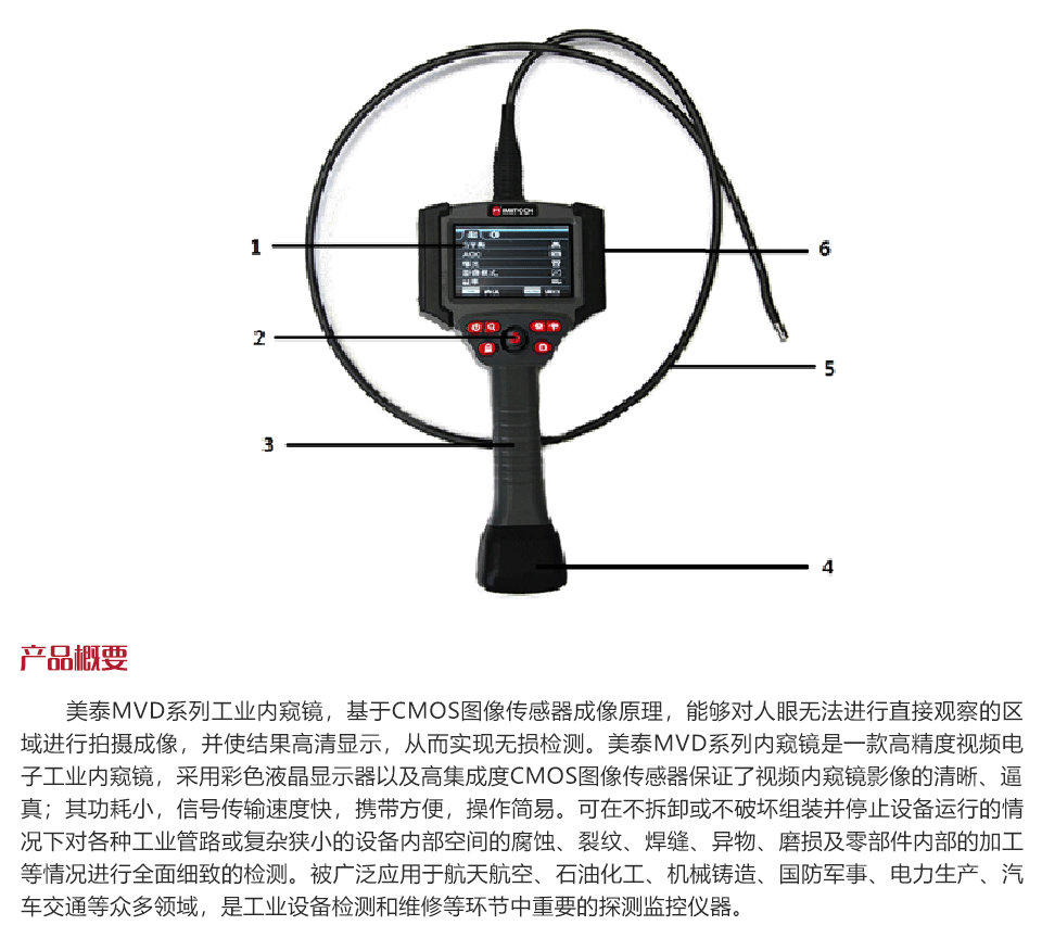 產(chǎn)品概述美泰MVD系列工業(yè)內(nèi)窺鏡,基于CMOS圖像傳感器成像原理,能夠?qū)θ搜蹮o法進行直接觀察的區(qū)域進行拍攝成像,高清顯示,從而實現(xiàn)無損檢測。美泰MVD系列內(nèi)窺鏡是一款高精度視頻電子工業(yè)內(nèi)窺鏡,采用彩色液晶顯示器以及高集成度CMOS圖像傳感器保證了視頻內(nèi)窺鏡影像的清晰、逼真;功耗小,信號傳輸速度快,攜帶方便,操作簡易。可在不拆卸或破壞組裝及停止設(shè)備運行的情況下對各種工業(yè)管路或復(fù)雜狹小的設(shè)備內(nèi)部空間的腐蝕、裂紋、焊縫、異物、磨損及零部件內(nèi)部的加工等情況進行全面細致的檢測。被廣泛應(yīng)用于航天航空、石油化工、機械鑄造、國防軍事、電力生產(chǎn)、汽車交通等眾多領(lǐng)域,是工業(yè)設(shè)備檢測和維修等環(huán)節(jié)中重要的探測監(jiān)控儀器。