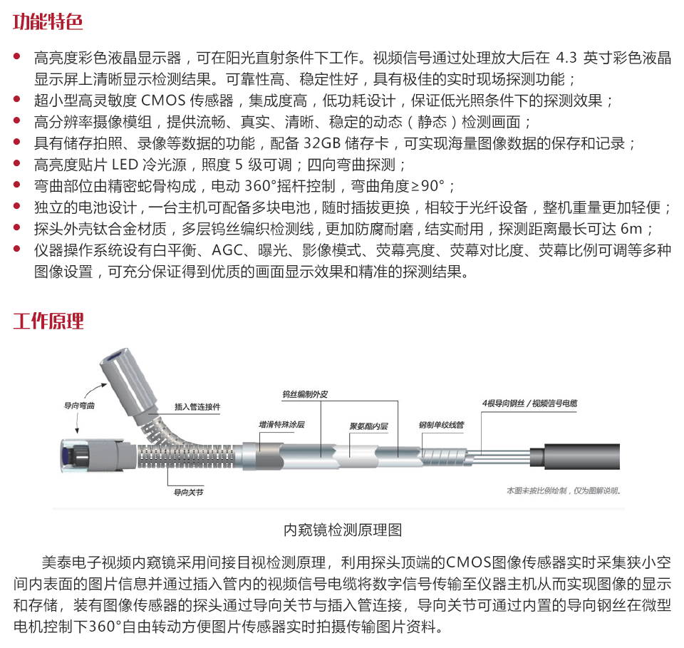 工作原理美泰電子視頻內(nèi)窺鏡采用間接目視檢測原理,利用探頭頂端的CMOS圖像傳感器實時采集狹小空間內(nèi)表面的圖片信息并通過插入管內(nèi)的視頻信號電纜將數(shù)字信號傳輸至儀器主機從而實現(xiàn)圖像的顯示和存儲,裝有圖像傳感器的探頭通過導(dǎo)向關(guān)節(jié)與插入管連接,導(dǎo)向關(guān)節(jié)可通過內(nèi)置的導(dǎo)向鋼絲在微型電機控制下360°自由轉(zhuǎn)動方便圖片傳感器實時拍攝傳輸圖片資料。