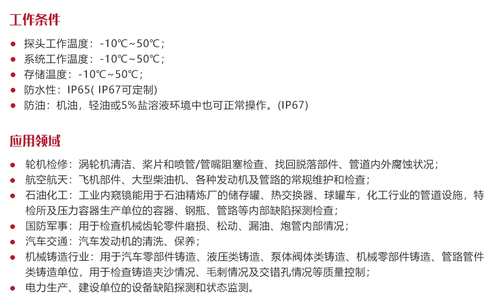 適用于狹小空間的視頻檢測,可針對狹小空間、管路,發(fā)動機,零部件、液壓、氣動件,鑄件內(nèi)部進行檢測。 |
