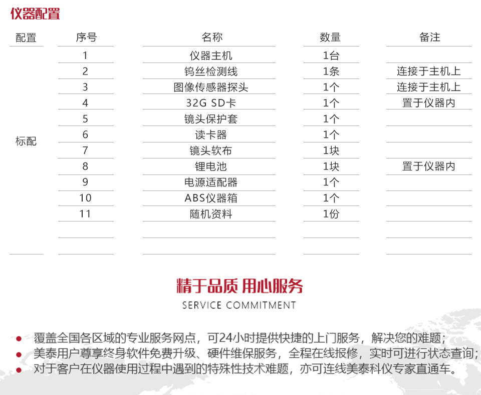 | 美泰電子內(nèi)窺鏡附有專用的隨機裝箱資料。包括產(chǎn)品合格證、保修卡、產(chǎn)品說明書、裝箱清單。隨機資料采用專用的銅版紙印制,說明書的圖文設(shè)計美觀、易懂、便于長久保存。注:美泰品牌系列產(chǎn)品的隨機資料均可登陸www.meijiausa.com下載電子版。 | |