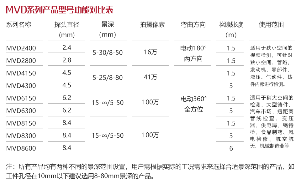 注:所有產(chǎn)品均有兩種不同的景深范圍設(shè)置,用戶需根據(jù)實際的工況需求來選擇合適景深范圍的產(chǎn)品,如工件孔徑在10mm以下建議選用8-80mm景深的產(chǎn)品 。