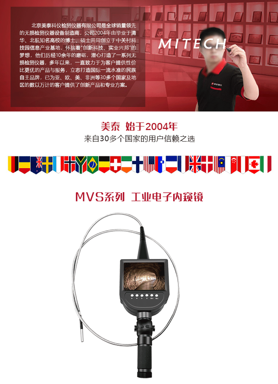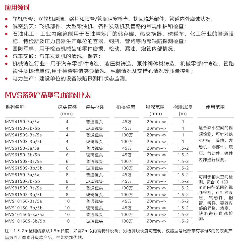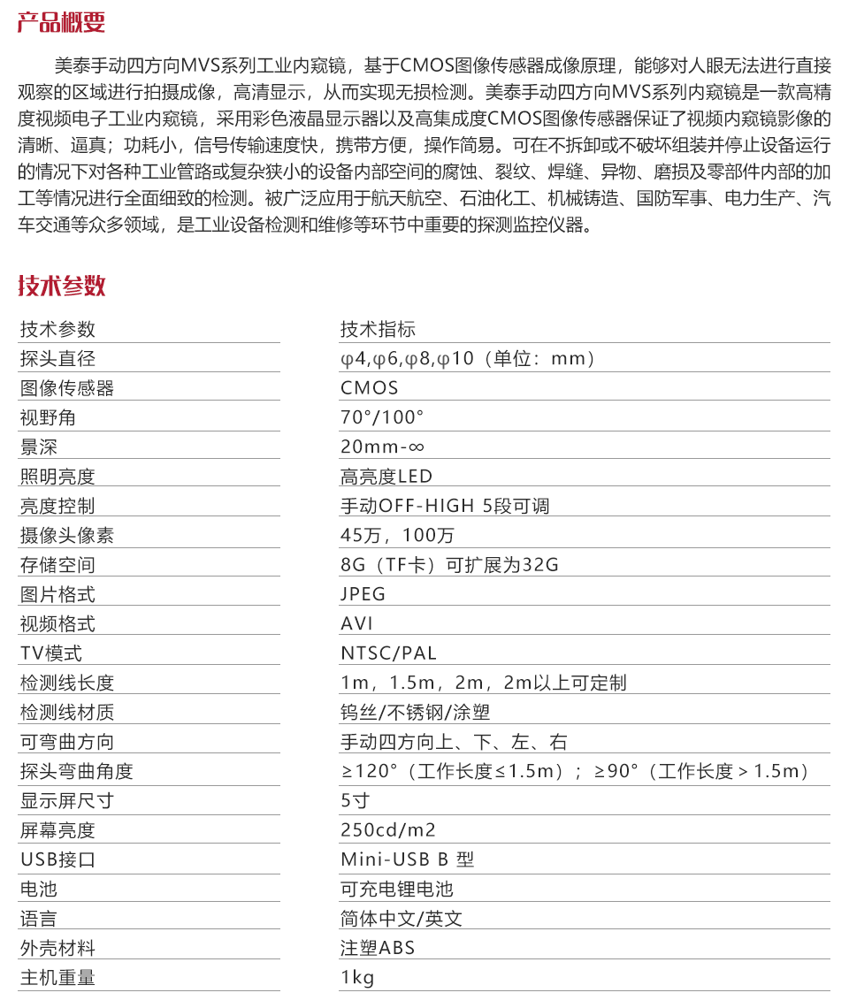 產(chǎn)品概述美泰手動(dòng)四方向MVS系列工業(yè)內(nèi)窺鏡,基于CMOS圖像傳感器成像原理,能夠對(duì)人眼無(wú)法進(jìn)行直接觀察的區(qū)域進(jìn)行拍攝成像,高清顯示,從而實(shí)現(xiàn)無(wú)損檢測(cè)。美泰手動(dòng)四方向MVS系列內(nèi)窺鏡是一款高精度視頻電子工業(yè)內(nèi)窺鏡,采用彩色液晶顯示器以及高集成度CMOS圖像傳感器保證了視頻內(nèi)窺鏡影像的清晰、逼真;功耗小,信號(hào)傳輸速度快,攜帶方便,操作簡(jiǎn)易。可在不拆卸或不破壞組裝并停止設(shè)備運(yùn)行的情況下對(duì)各種工業(yè)管路或復(fù)雜狹小的設(shè)備內(nèi)部空間的腐蝕、裂紋、焊縫、異物、磨損及零部件內(nèi)部的加工等情況進(jìn)行全面細(xì)致的檢測(cè)。被廣泛應(yīng)用于航天航空、石油化工、機(jī)械鑄造、國(guó)防軍事、電力生產(chǎn)、汽車交通等眾多領(lǐng)域,是工業(yè)設(shè)備檢測(cè)和維修等環(huán)節(jié)中重要的探測(cè)監(jiān)控儀器。