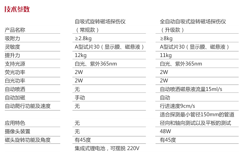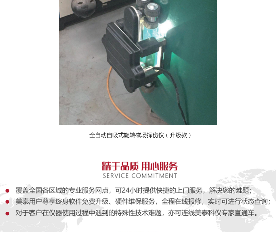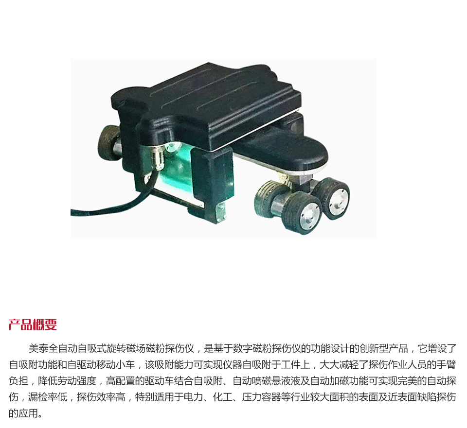 產(chǎn)品概述美泰全自動自吸式旋轉(zhuǎn)磁場磁粉探傷儀,是基于數(shù)字磁粉探傷儀的功能設(shè)計的創(chuàng)新型產(chǎn)品,它增設(shè)了自吸附功能和自驅(qū)動移動小車,該吸附能力可實現(xiàn)儀器自吸附于工件上,大大減輕了探傷作業(yè)人員的手臂負擔,降低勞動強度,高配置的驅(qū)動車結(jié)合自吸附、自動噴磁懸液液及自動加磁功能可實現(xiàn)完美的自動探傷,漏檢率低,探傷效率高,特別適用于電力、化工、壓力容器等行業(yè)較大面積的表面及近表面缺陷探傷的應(yīng)用。