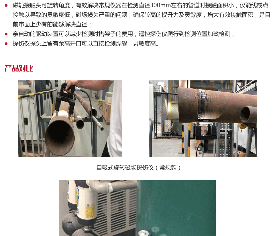 ? 磁軛接觸頭可旋轉(zhuǎn)角度,有效解決常規(guī)儀器在檢測直徑300mm左右的管道時接觸面積小,僅能線或點接觸以導(dǎo)致的靈敏度低,磁場損失嚴重的問題,確保較高的提升力及靈敏度,增大有效接觸面積,是目前市面上少有的能夠解決直徑300mm以下管道的全自動磁粉探傷設(shè)備;