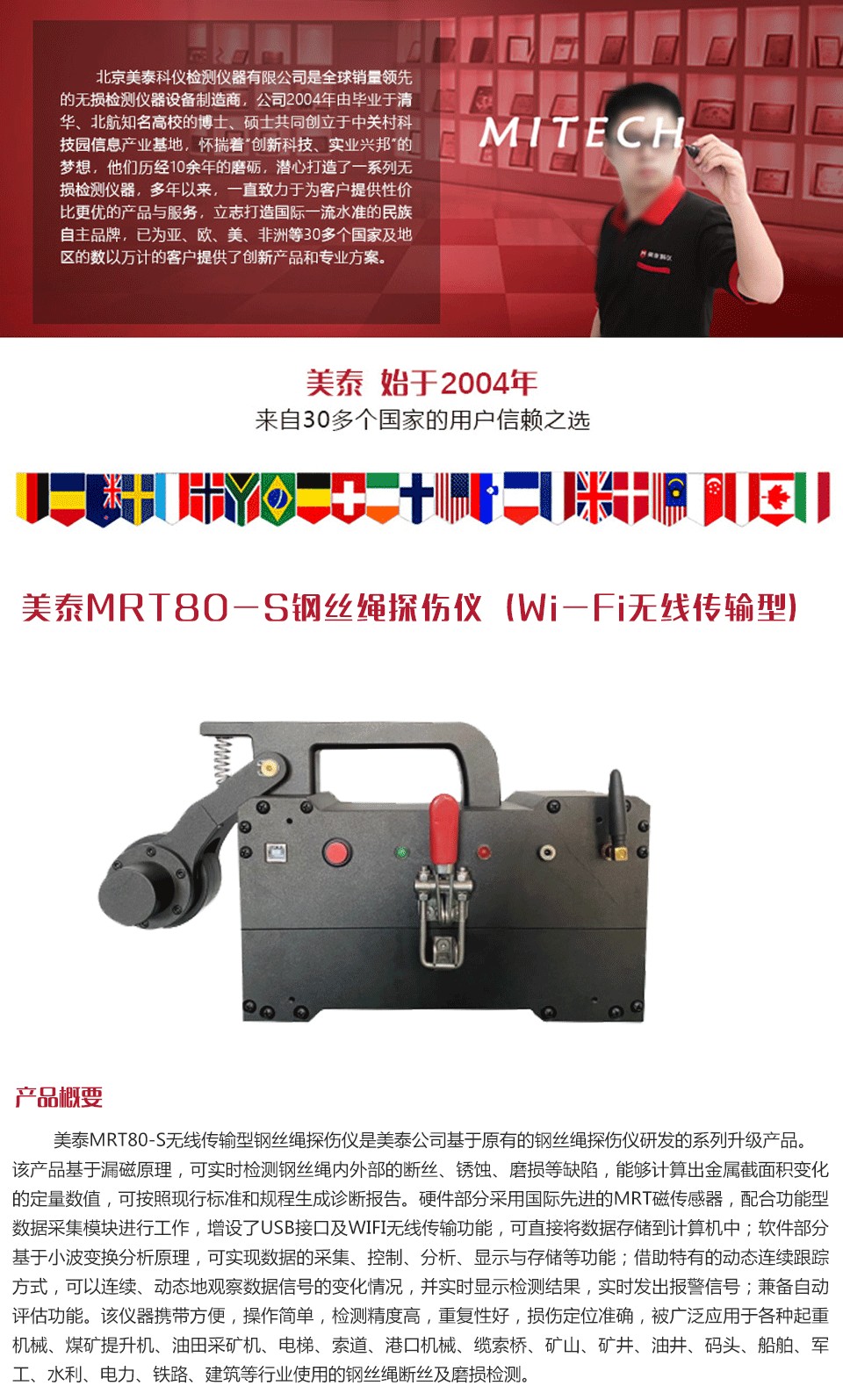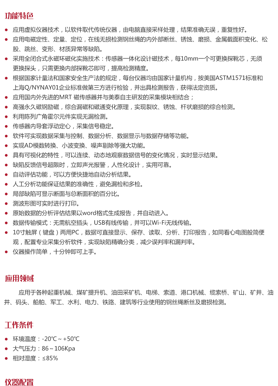 產品概述美泰MRT80-S無線傳輸型鋼絲繩探傷儀是美泰公司基于原有的鋼絲繩探傷儀研發的系列升級產品。該產品基于漏磁原理,可實時檢測鋼絲繩內外部的斷絲、銹蝕、磨損等缺陷,能夠計算出金屬截面積變化的定量數值,可按照現行標準和規程生成診斷報告。硬件部分采用國際先進的MRT磁傳感器,配合功能型數據采集模塊進行工作,增設了USB接口及WIFI無線傳輸功能,可直接將數據存儲到計算機中;軟件部分基于小波變換分析原理,可實現數據的采集、控制、分析、顯示與存儲等功能;借助特有的動態連續跟蹤方式,可以連續、動態地觀察數據信號的變化情況,并實時顯示檢測結果,實時發出報警信號;兼備自動評估功能。該儀器攜帶方便,操作簡單,檢測精度高,重復性好,損傷定位準確,被廣泛應用于各種起重機械、煤礦提升機、油田采礦機、電梯、索道、港口機械、纜索橋、礦山、礦井、油井、碼頭、船舶、軍工、水利、電力、鐵路、建筑等行業使用的鋼絲繩斷絲及磨損檢測。