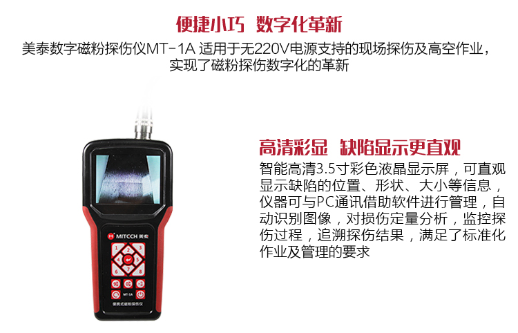 產(chǎn)品概述MT-1A型便攜式數(shù)字磁粉探傷儀,采用大容量鋰電池組供電,將充電電池提供的直流電經(jīng)過(guò)變頻逆變和信號(hào)移相處理,為磁粉探傷提供磁化電源,解決了傳統(tǒng)磁粉探傷儀依賴(lài)220V電源的弊端;功耗低,一次充電可連續(xù)工作4小時(shí)以上,電池可以在線(xiàn)充電和脫機(jī)充電。可對(duì)探傷過(guò)程進(jìn)行實(shí)時(shí)監(jiān)控,具備圖像處理功能,可存儲(chǔ)數(shù)據(jù)、打印測(cè)試報(bào)告、跟蹤追溯探傷結(jié)果,滿(mǎn)足了標(biāo)準(zhǔn)化作業(yè)及管理的要求。特別適用于野外無(wú)電源的現(xiàn)場(chǎng)探傷及高空作業(yè),它實(shí)現(xiàn)了磁粉探傷數(shù)字化的革新。