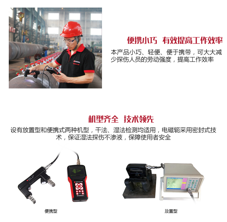 ?設(shè)有放置型和便攜型兩種機(jī)型,干法、濕法檢測(cè)均適用,電磁軛采用密封式技術(shù),保證濕法探傷不滲液,保障使用者安全。