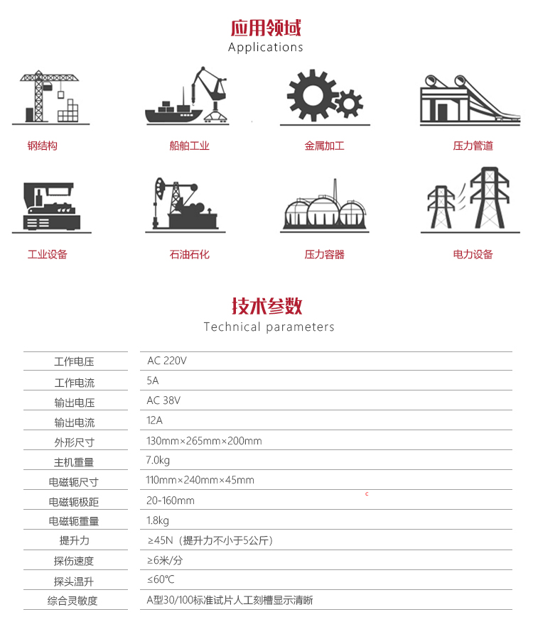 功能用途飛機制造、鍋爐壓力容器、電力、油田、造船、汽輪機和內燃機配件、煤礦、機械、標準件、油泵油嘴、汽車零件、造橋、化工、鐵路、大型機械零部件、鋼結構設備等行業產品;因鍛壓、淬火、焊接、疲勞等引起的表面及近表面缺陷,如鏈桿、曲軸、軸承、高強度螺栓、彈簧、鍛件、石化管件、閥門、葉片、齒輪、錨鏈以及焊縫等幾何形狀復雜的工件等。