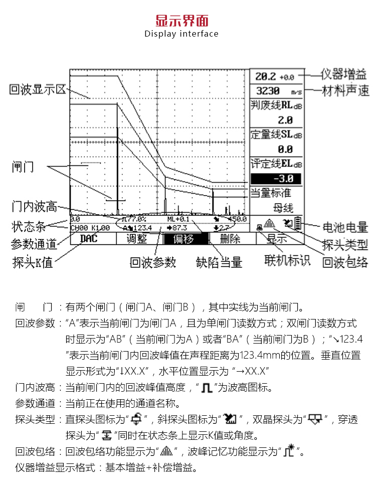 ?自動關機:當電池電壓太低時,屏幕上的電池圖標會閃爍顯示,然后探傷儀會自動關機斷電。