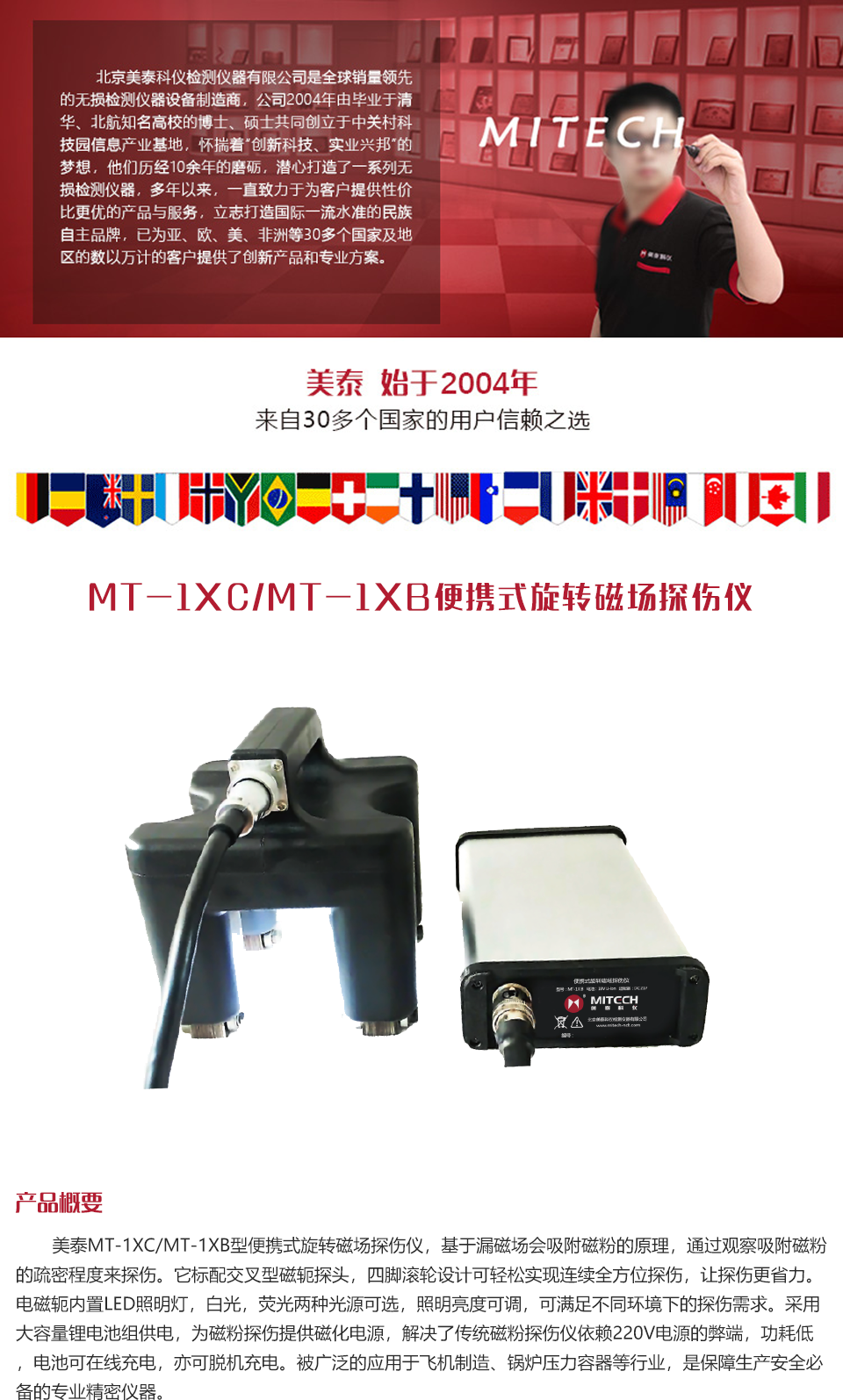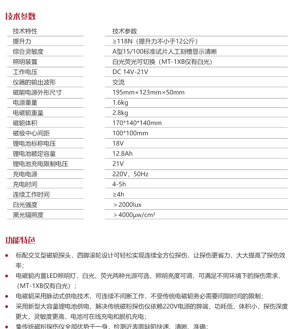 產(chǎn)品概述美泰MT-1XC/MT-1XB型便攜式旋轉(zhuǎn)磁場探傷儀,基于漏磁場會吸附磁粉的原理,通過觀察吸附磁粉的疏密程度來探傷。它標配交叉型磁軛探頭,四腳滾輪設(shè)計可輕松實現(xiàn)連續(xù)全方位探傷,讓探傷更省力。電磁軛內(nèi)置LED照明燈,白光,熒光兩種光源可選,照明亮度可調(diào),可滿足不同環(huán)境下的探傷需求。采用大容量鋰電池組供電,為磁粉探傷提供磁化電源,解決了傳統(tǒng)磁粉探傷儀依賴220V電源的弊端,功耗低,電池可在線充電,亦可脫機充電。被廣泛的應(yīng)用于飛機制造、鍋爐壓力容器等行業(yè),是保障生產(chǎn)安全必備的專業(yè)精密儀器。