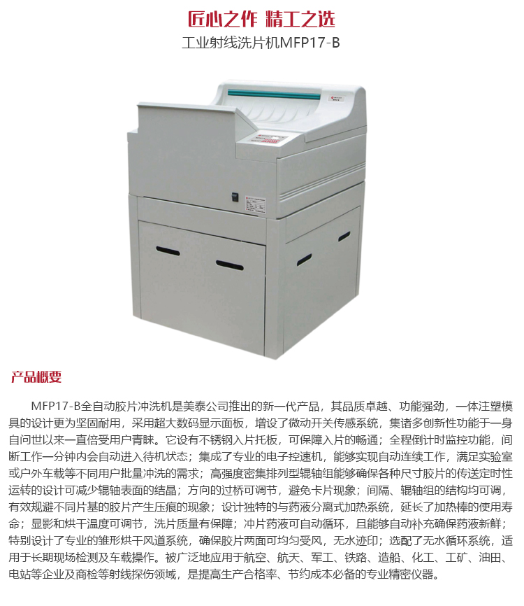 產品概述MFP17-B全自動膠片沖洗機是美泰公司推出的新一代產品,其品質卓越、功能強勁,一體注塑模具的設計更為堅固耐用,采用超大數碼顯示面板,增設了微動開關傳感系統,集諸多創新性功能于一身,自問世以來一直倍受用戶青睞。它設有不銹鋼入片托板,可保障入片的暢通;全程倒計時監控功能,間斷工作一分鐘內會自動進入待機狀態;集成了專業的電子控速機,能夠實現自動連續工作,滿足實驗室或戶外車載等不同用戶批量沖洗的需求;高強度密集排列型輥軸組能夠確保各種尺寸膠片的傳送;定時性運轉的設計可減少輥軸表面的結晶;方向的過橋可調節,避免卡片現象;間隔、輥軸組的結構均可調,有效規避不同片基的膠片產生壓痕的現象;設計獨特的與藥液分離式加熱系統,延長了加熱棒的使用壽命;顯影和烘干溫度可調節,洗片質量有保障;沖片藥液可自動循環,且能夠自動補充,確保藥液新鮮;特別設計了專業的雛形烘干風道系統,確保膠片兩面可均勻受風,無水跡印;選配了無水循環系統,適用于長期現場檢測及車載操作。被廣泛地應用于航空、航天、軍工、鐵路、造船、化工、工礦、油田、電站等企業及商檢等射線探傷領域,是提高生產合格率、節約成本必備的專業精密儀器。
