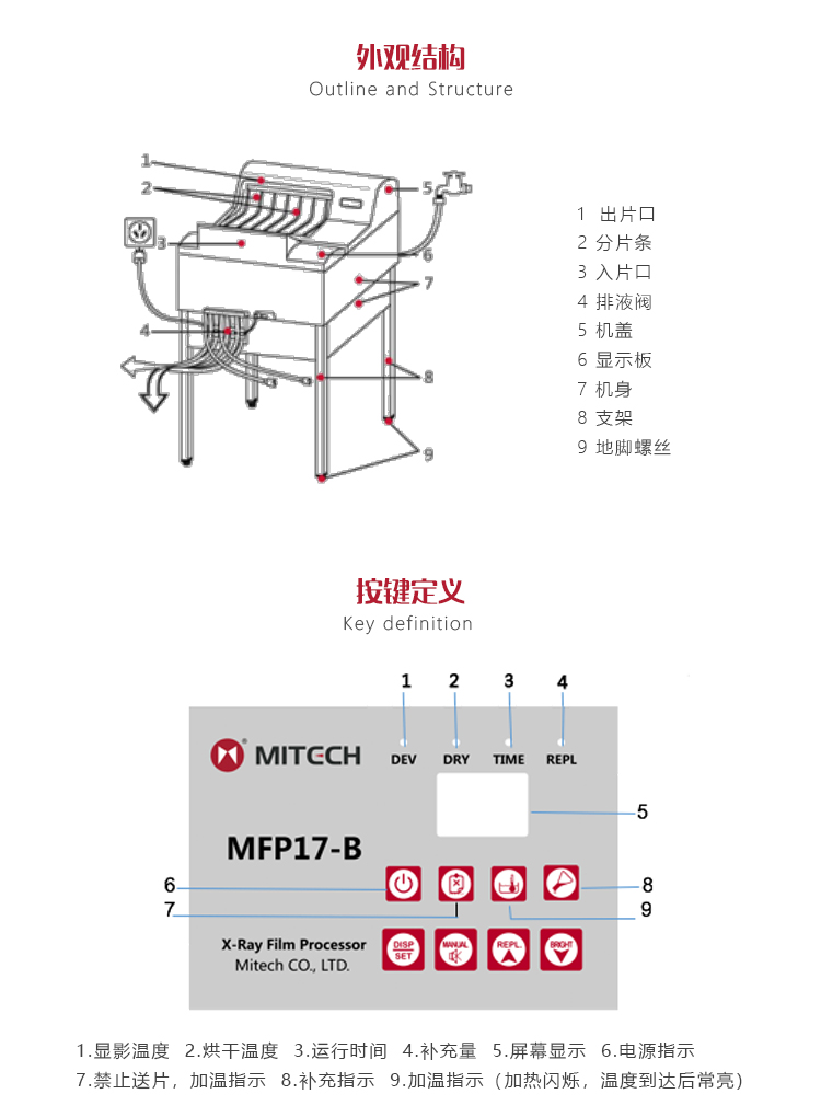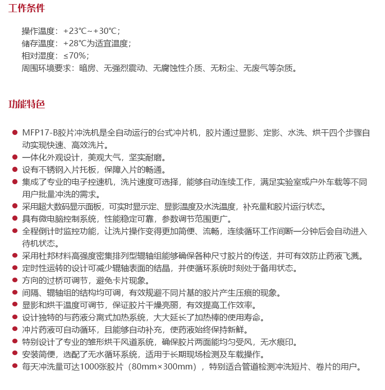 功能用途MFP17-B膠片沖洗機是全自動運行的臺式沖片機,膠片通過顯影、定影、水洗、烘干四個步驟自動實現快速、高效洗片。