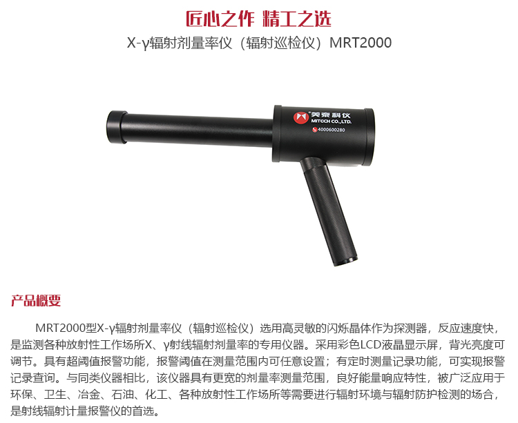 MRT2000型X-γ輻射劑量率儀(輻射巡檢儀) 選用高靈敏的閃爍晶體作為探測(cè)器,反應(yīng)速度快,是監(jiān)測(cè)各種放射性工作場(chǎng)所X、γ射線輻射劑量率的專用儀器。采用彩色LCD液晶顯示屏,背光亮度可調(diào)節(jié)。具有超閾值報(bào)警功能,報(bào)警閾值在測(cè)量范圍內(nèi)可任意設(shè)置;有定時(shí)測(cè)量記錄功能,可實(shí)現(xiàn)報(bào)警記錄查詢。與同類儀器相比,該儀器具有更寬的劑量率測(cè)量范圍,良好能量響應(yīng)特性,被廣泛應(yīng)用于環(huán)保、衛(wèi)生、冶金、石油、化工、各種放射性工作場(chǎng)所等需要進(jìn)行輻射環(huán)境與輻射防護(hù)檢測(cè)的場(chǎng)合,是射線輻射計(jì)量報(bào)警儀的首選。