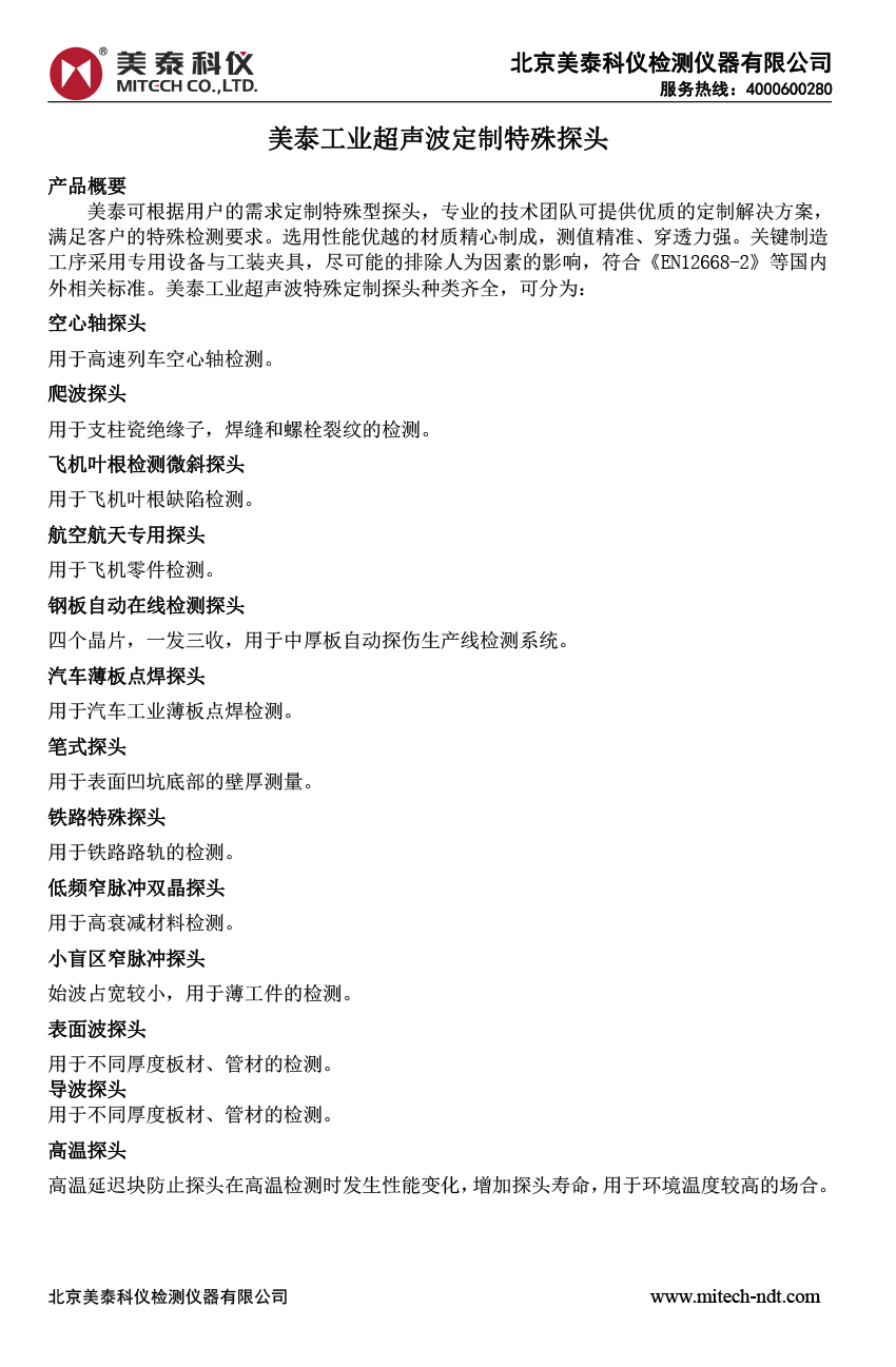 美泰可根據用戶的需求定制特殊型探頭,專業的技術團隊可提供優質的定制解決方案,滿足客戶的特殊檢測要求。選用性能優越的材質精心制成,測值精準、穿透力強。關鍵制造工序采用專用設備與工裝夾具,盡可能的排除人為因素的影響,符合《EN12668-2》等國內外相關標準。