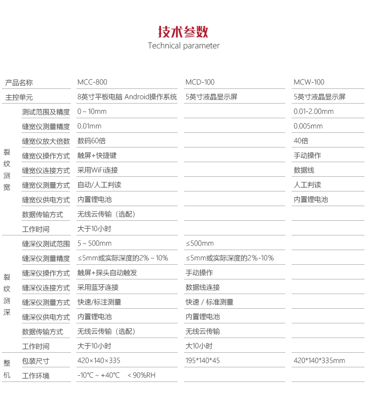 產品概述美泰MCC-800無線型裂縫綜合檢測儀,集裂縫測寬和測深的功能于一體,通過無線信號傳輸,可自動識別多種探頭,能夠快速無損檢測構件表面裂縫寬度及深度。其測量速度快、測量精度高、性能穩定可靠,可實現自動測量,自動判讀及存儲,被廣泛的應用于橋梁、隧道、塔、建筑物、混凝土構件、路面等領域的工程質量檢測,是保障生命財產安全必備的專業精密檢測儀器。