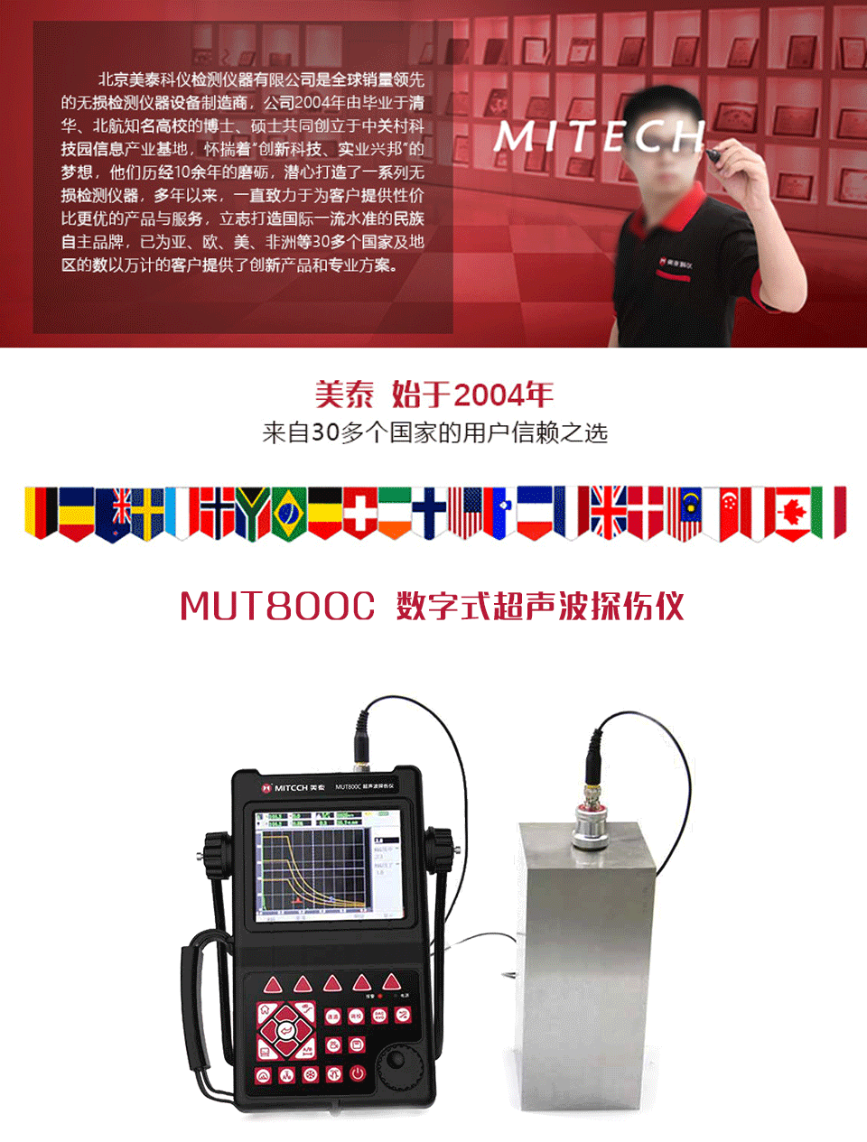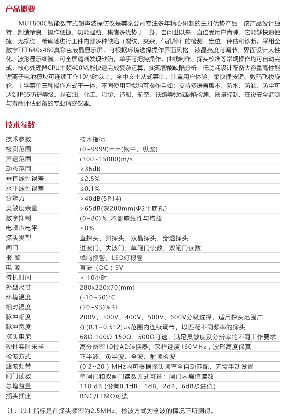 產品概述MUT800C智能數字式超聲波探傷儀是美泰公司專注多年精心研制的主打優勢產品,該產品設計獨特、制造精良、操作便捷、功能強勁,集諸多優勢于一身,自問世以來一直倍受用戶親睞,它能夠快速便捷、無損傷、精確地進行工件內部多種缺陷(裂紋、夾雜、氣孔等)的檢測、定位、評估和診斷。采用全數字TFT 640×480真彩色液晶顯示屏,可根據環境選擇操作界面風格,液晶亮度可調節,界面設計人性化、波形顯示細膩;可全屏清晰發現缺陷;單手可把持操作,曲線制作、探頭校準等常規操作均可自動完成;核心處理器CPU主頻400M,能快速完成復雜運算,實現智能缺陷分析;低功耗設計配備大容量高性能鋰離子電池模塊可連續工作10小時以上;全中文主從式菜單,注重用戶體驗,集快捷按鍵、數碼飛梭旋輪、十字菜單三種操作方式于一體,不同使用習慣均可操作自如;支持多語言版本。防水、防油、防塵可達到IP65防護等級。是石油、化工、冶金、造船、航空、鐵路等領域缺陷檢測、質量控制、在役安全監測與壽命評估必備的專業精密儀器。